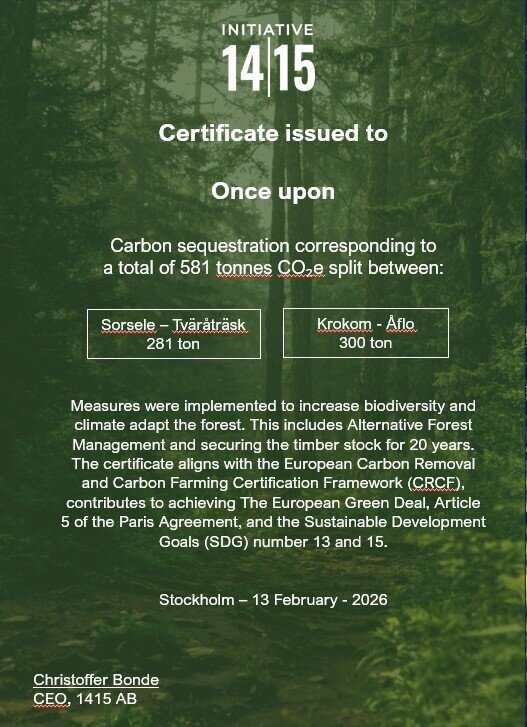 Once Upon investiert in Projekte außerhalb unserer Wertschöpfungskette, die mehr als 200 % unserer Gesamtemissionen (Bereich 1, 2 und 3) ausgleichen. Unser internes Budget hierfür beträgt 1.000 SEK (schwedische Kronen) pro Tonne CO₂.