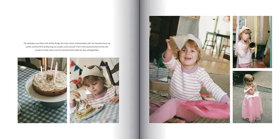 You can add up to six images per spread. Combine photos with text and captions to make your book even more personal. You can also choose from ten different cover colors to match your style.